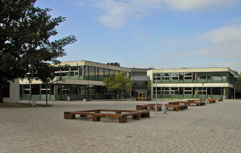 Neugestalteter Schulhof; Blick auf das Hauptgebäude